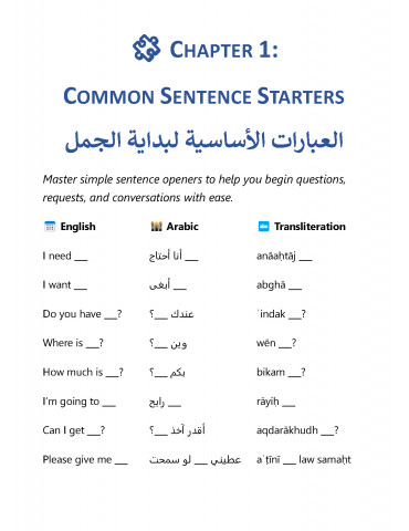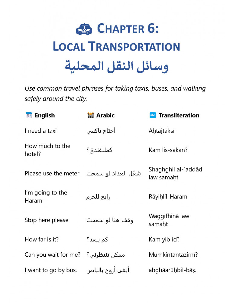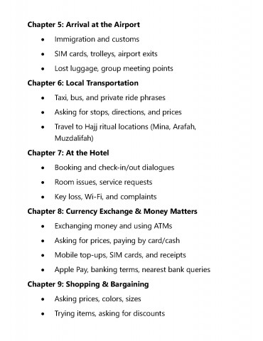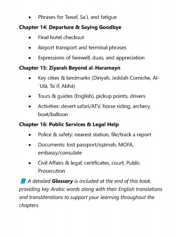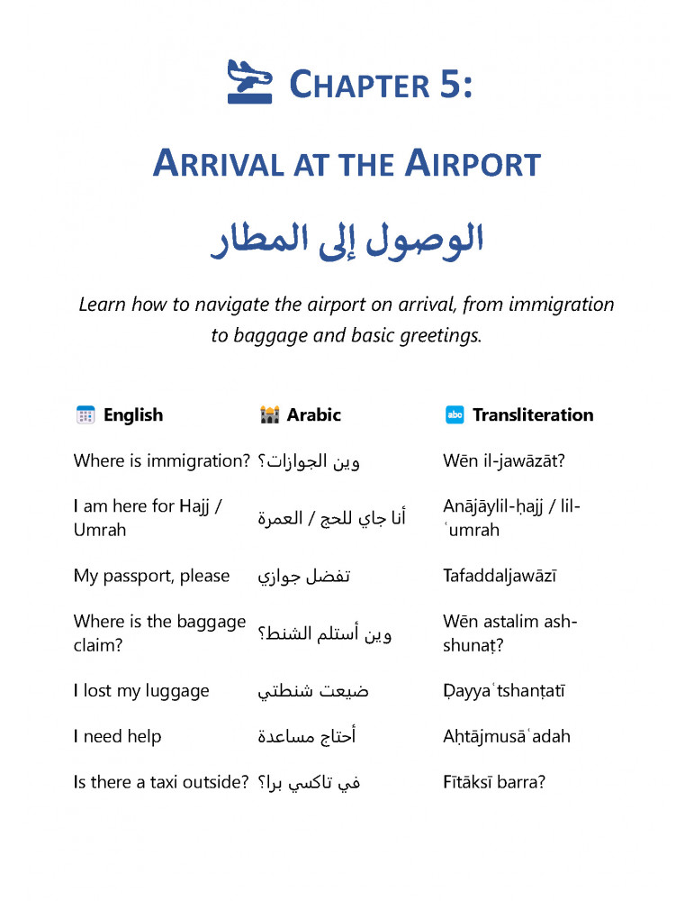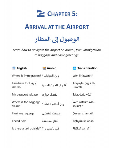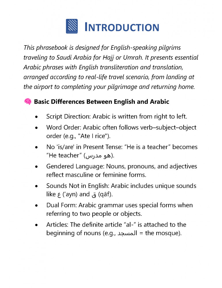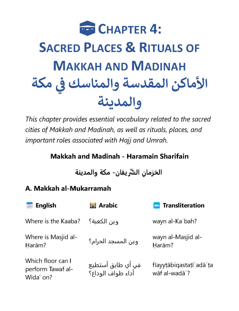 It has been observed that many pilgrims face challenges in communication-whether seeking directions, shopping, arranging transportation, or managing essential tasks during their sacred journey. This book seeks to ease those moments by providing simple, clear, and useful Arabic phrases com-monly needed in everyday situations.