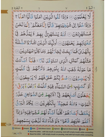 The Holy Quran, Colour coded Tajweed Rules Hard Back with beautiful Kabah Cover, It has symbols denoting pauses in Quranic Arabic Text. Seven beautiful rainbow colours, covers whole Quran 13 Lines Quran and each page ends with complete Ayah. This is easy for Hifz and memorization of the Quran.