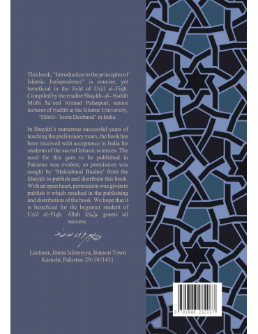 This book, "Introduction to the principles of Islamic Jurisprudence", is concise, yet beneficial in the field of Usul al-Fiqh. Compiled by the erudite Shaykh-al Hadith Mufti Sa'eed Ahmad Palanpuri (RA), senior lecturer of Hadith at the Islamic University, Darul Uloom Deoband in India.