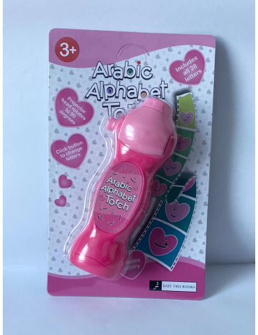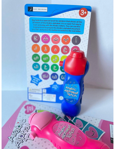The Arabic Torch is offered in vibrant Pink and Blue. It provides an engaging approach to learning the Arabic Alphabet with enjoyment. Simply press the button on the Torch's side to seamlessly transition to the next Arabic letter, projecting all 27 letters of the Arabic alphabet. This device can project onto any surface and has a long battery life for prolonged use.