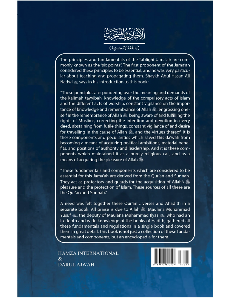 The book Muntakhab Ahadith is a selection of Quranic veres & authentic Ahadith, relating to the Six Points of Dawat and Tabligh. Originally written in Arabic by the Late Scholar Maulana Muhammad Yusuf Kandhlawi, also known as Hazratjee duing the last phase of his devoted life.