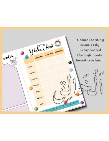 ‘Aminah’s Prayer Beads Activity Book’ has been professionally created to develop essential pre-school skills. These include: recognising colours, counting and forming numbers to ten, understanding first sounds, oral sentence building and much more!