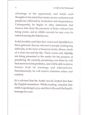 This book contains such Qur'anic verses and hadiths that are relevant to people undergoing difficulty, in the form of financial straits, death of a close one and the like. These verses and hadiths are presented so that the reader may ponder over them and find the answers to his or her problems, and be able to derive lessons from its warnings and admonitions. Simultaneously, he or she will receive immense solace and comfort.