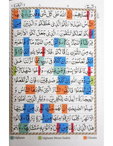 Colour Coded Quran With Tajweed Rules in 30 separate parts. Seven different-color shades have been used: each color representing a different tajwid rule. The actual rules of tajwid in English are included in the back of the last part. This edition of the Qur'an in 30 separate parts can help those who desire to recite the Qur'an correctly with the proper pronunciations and intonations.
