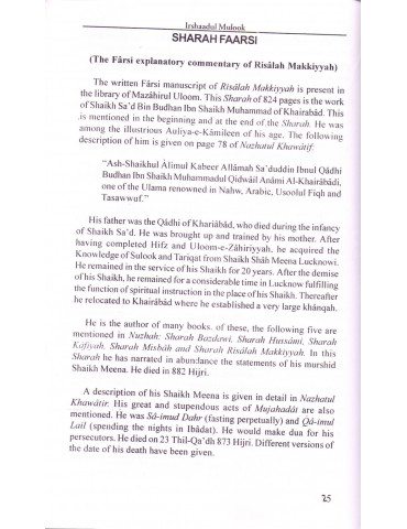 Shaykh Rashid Ahmad Gangohi translated a few sections of Shaykh Qutbuddin's Risalah Makkiyah in the Persian language, naming it Imdad as-Sulook. His disciple, Shaykh Aashiq Ilahi then translated it into Urdu and named it Irshadul Mulook. This is the English Translation of that work.