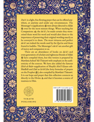 There are an abundance of books on duas, and every generation of scholars and righteous friends of Allah ﷻ have compiled them, but this version is prepared by Mawlana Ashraf Ali Thanawi with emphasis on the authenticity of the sources. We have also added the famous Hizb al-Bahr supplication of Shaykh Abul-Hasan ash-Shadhili and Zad as-Said (the forty formulae of prayers on the Prophet ﷺ), also compiled by Mawlana Thanawi.