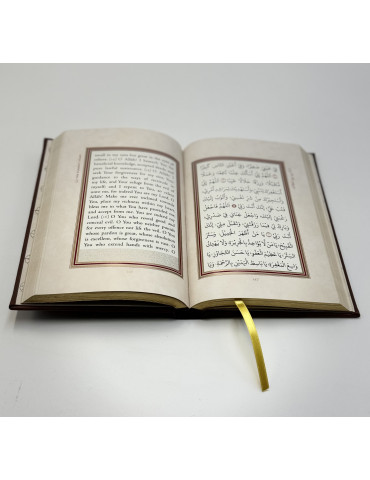 • Each page is set in twelve lines of Arabic text, with corresponding English translation, enclosed within a decorative gold and red frame.